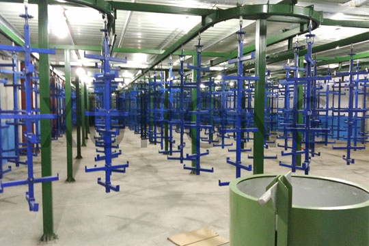 采用转盘式,连续循环过滤,是砂分布均匀,附着力强